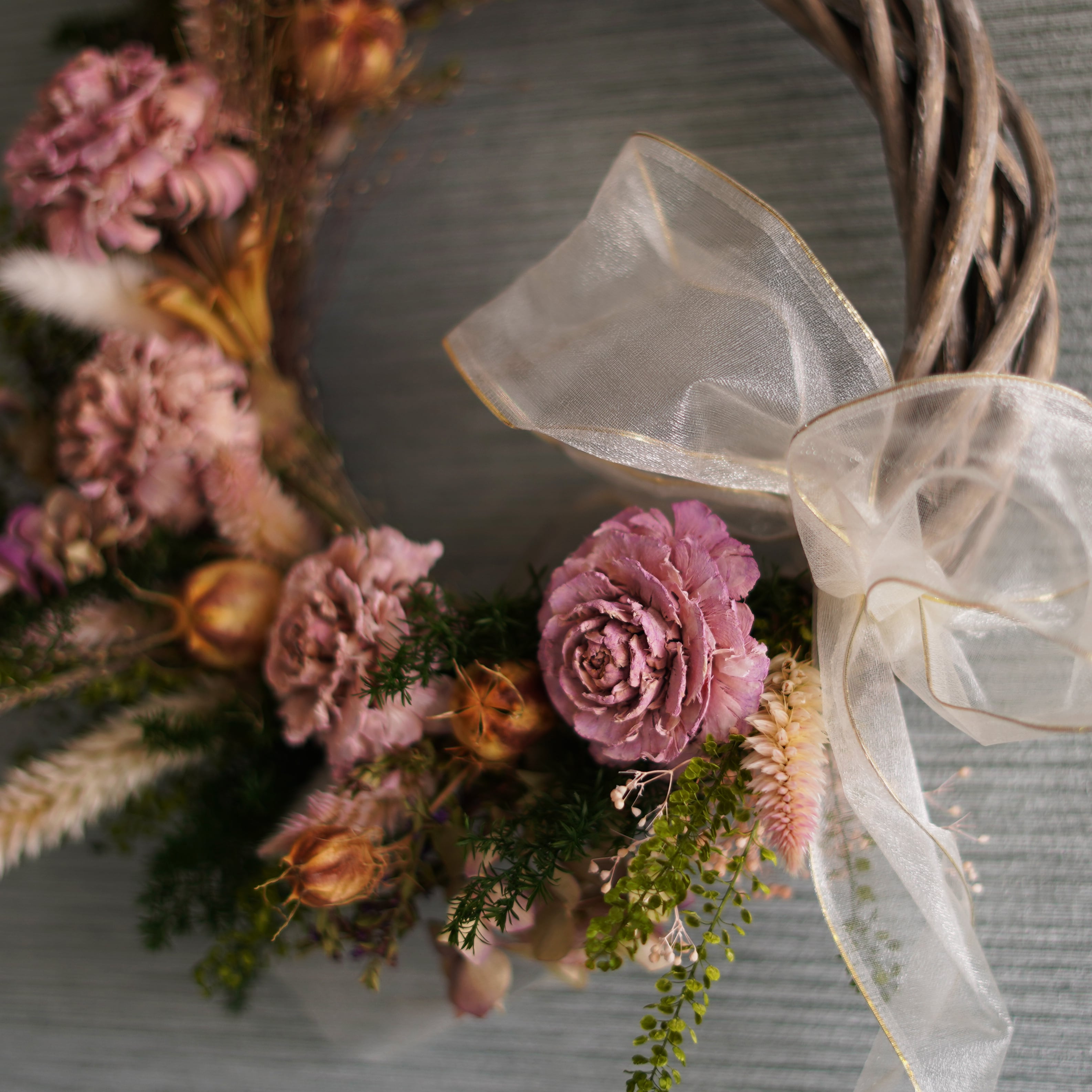 ローズとリボンがアクセントのドライフラワーリース